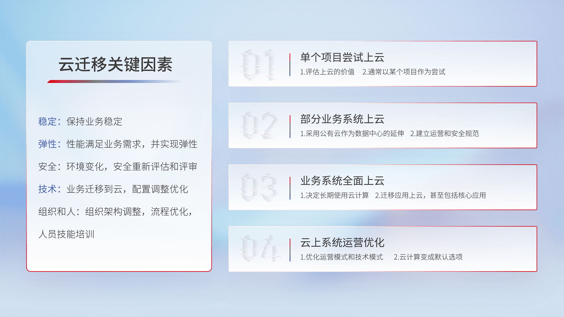 结合实际业务,,,,从规划设计、、、、云平台选型、、云原生改造、、数据迁移、、、、集成交付,,,迁移全过程为客户识别最佳上云路径,,,,做好风险识别管理,,,设计网络架构、、、、身份权限、、安全审计合规、、、、操作审计、、日志审计、、、监控告警策略、、多站点容灾设计等,,,,对云上基础设施进行整体规划,,,提升IT治理水平,,以满足弹性、、、、高可用、、、高性能的需求。。。