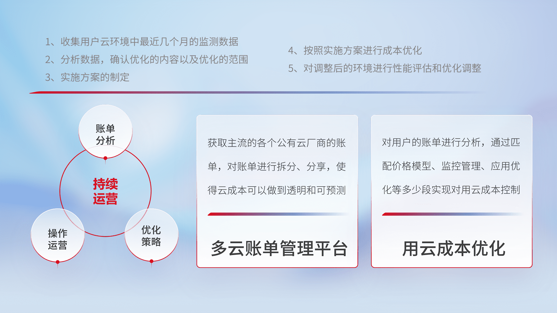 通过多云纳管,,,,以统一的资源数据模型把客户的云资源进行抽象和封装,,进而实现对多云资源的统一操作,,保障云资源管理的可靠性、、、稳定性与可用性。。。。量身定制化运维内容,,,,配置、、、开发运维、、、补丁管理、、、、备份、、监控、、认证和访问管理、、、、审计和日常巡检等,,,,保障在用云过程中的可靠度,,稳定度以及高可用率。。