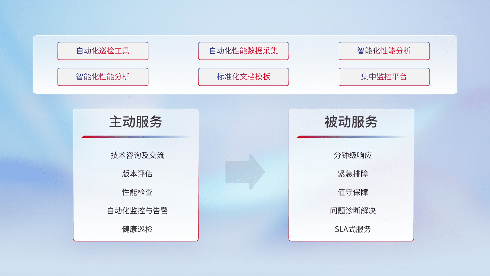 智能化工具和标准化文档,,保障服务质量,,,,提供主动服务(包含技术咨询、、版本评估、、、性能检查、、、、自动化监控与告警、、、、健康巡检)和被动服务包含(分钟级响应、、、紧急排障、、、、值守保障、、、、问题诊断解决、、SLA服务)。。