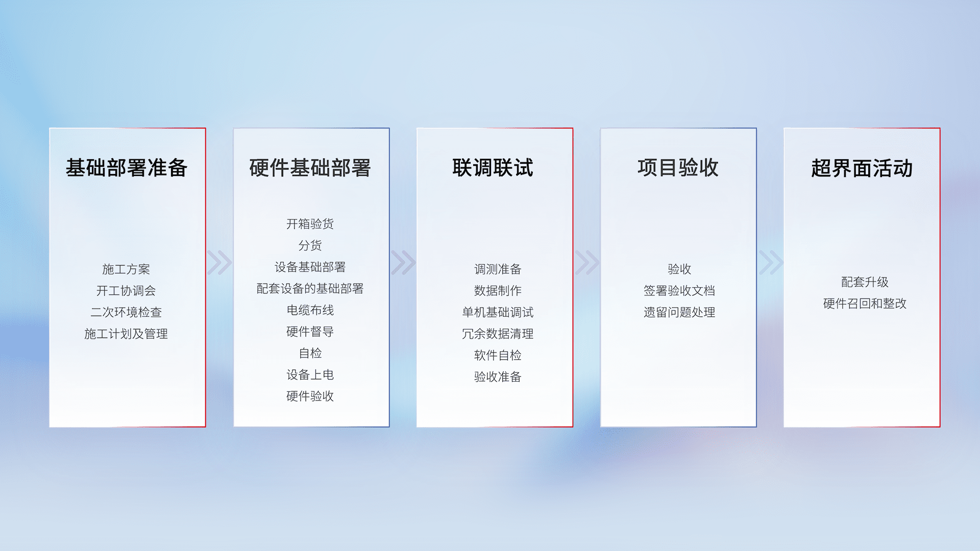 从基础部署准备、、、硬件基础部署、、联调联试、、、项目验收、、越界面活动的全过程可追溯,,保证施工质量和进度。。